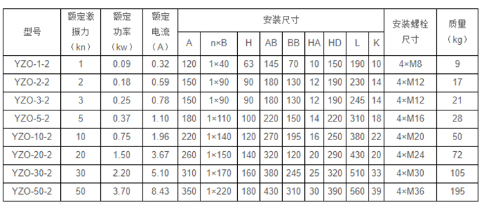 YZO振動電機的技術參數